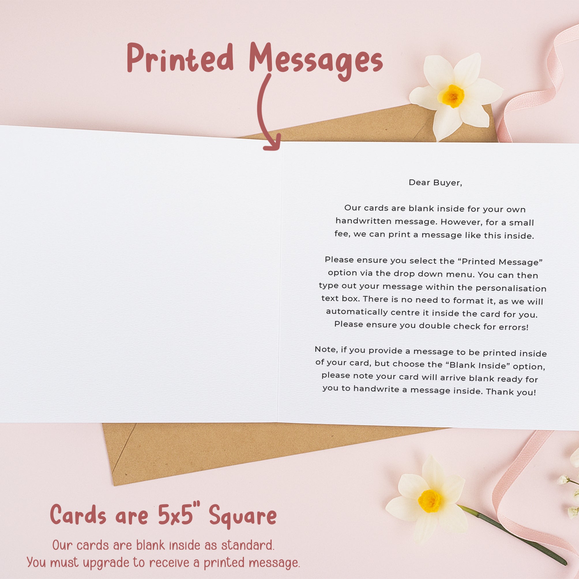 Our beautiful cards measure approximately 5x5 inches when folded and are crafted from premium 350gsm thick matte cardstock, offering a luxurious feel. Each card comes with a recycled kraft brown envelope, enhancing its rustic appeal. The inside is left blank for your own personalised handwritten message, but for an added touch, you can choose to have us print a custom message inside through the dropdown menu above.