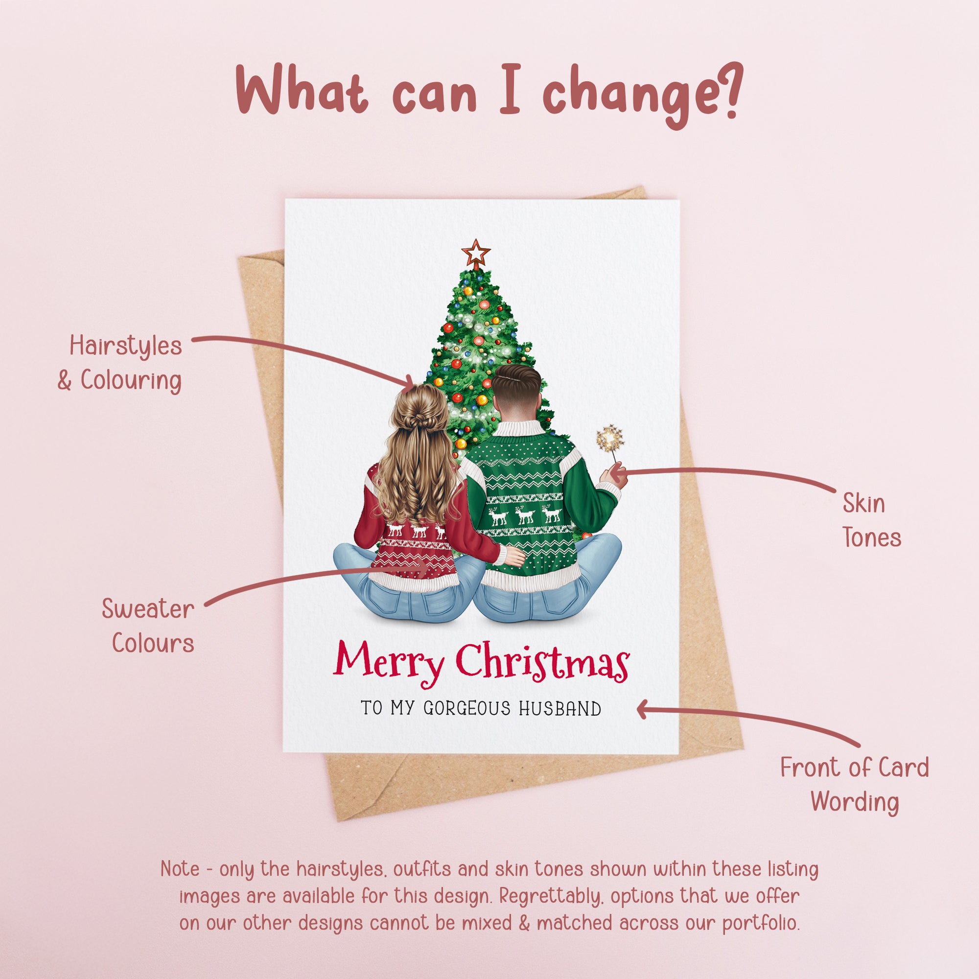 Create a heartwarming Christmas card featuring personalised illustrations of a husband and wife. Personalise the text to make it truly special, capturing the magic of the holiday season for your loved ones.