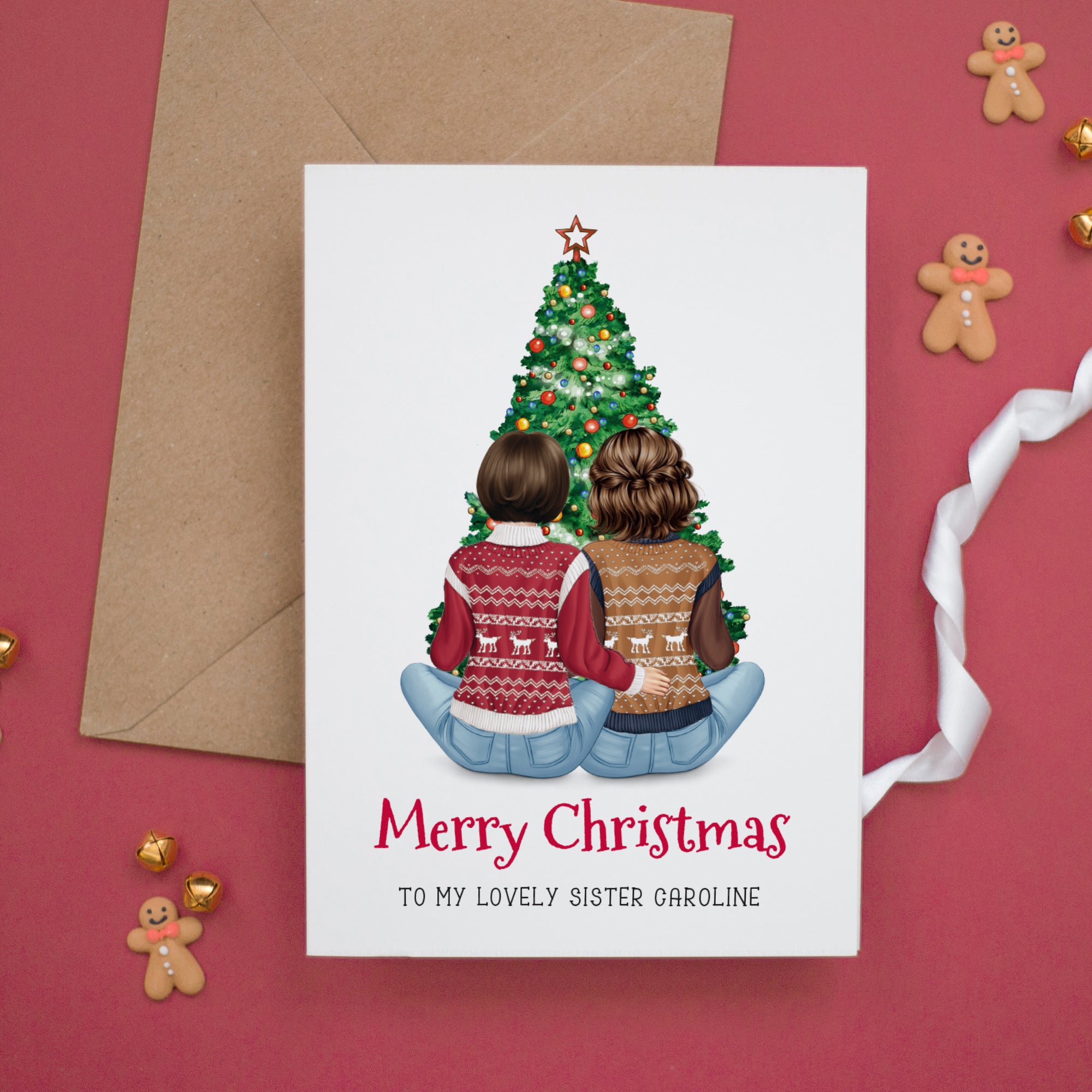 Create a heartwarming Christmas card featuring personalised illustrations of two sisters. Personalise the text to make it truly special, capturing the magic of the holiday season for your loved ones.