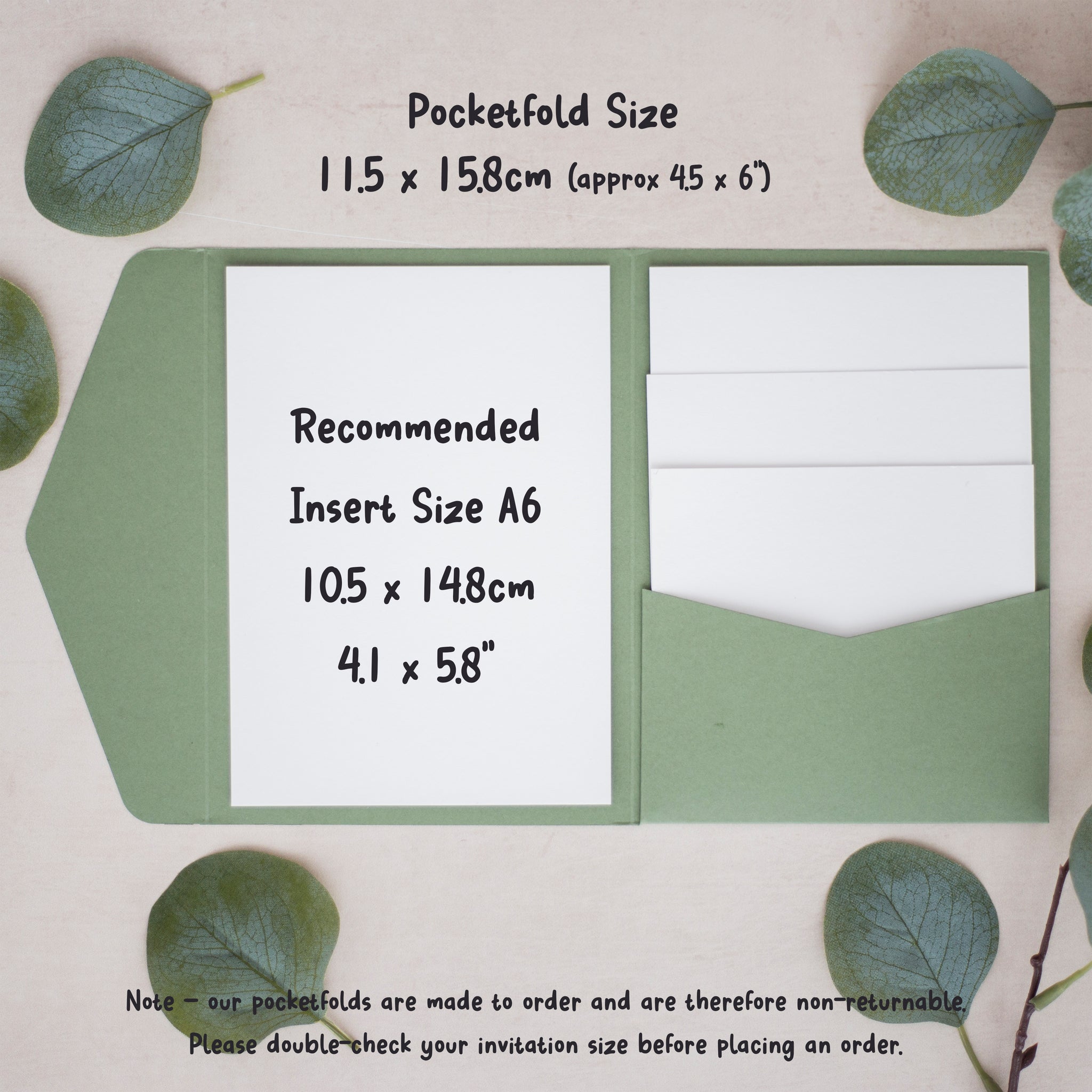 Our pocketfolds measure approximately 4.5 x 6.2 inches once folded. Our Invitations and inserts are a UK A6 size, which measures approximately 10.5 x 14.8cm, and will have staggered heights if you require more than 1 insert card. If ordering options 2, 3 or 4 above, we'll also provide you with either white or Kraft mailing envelopes, that you can use to mail your pocketfold invitations to your guests. Please note as our pocketfolds are made to order, they are strictly non-refundable, so please ensure you have double checked the sizes if you are ordering option 1 and supplying your own invitations/inserts. Colours may also appear differently on screen compared to the pocketfolds and invitation designs in person, this is completely normal and not a fault.