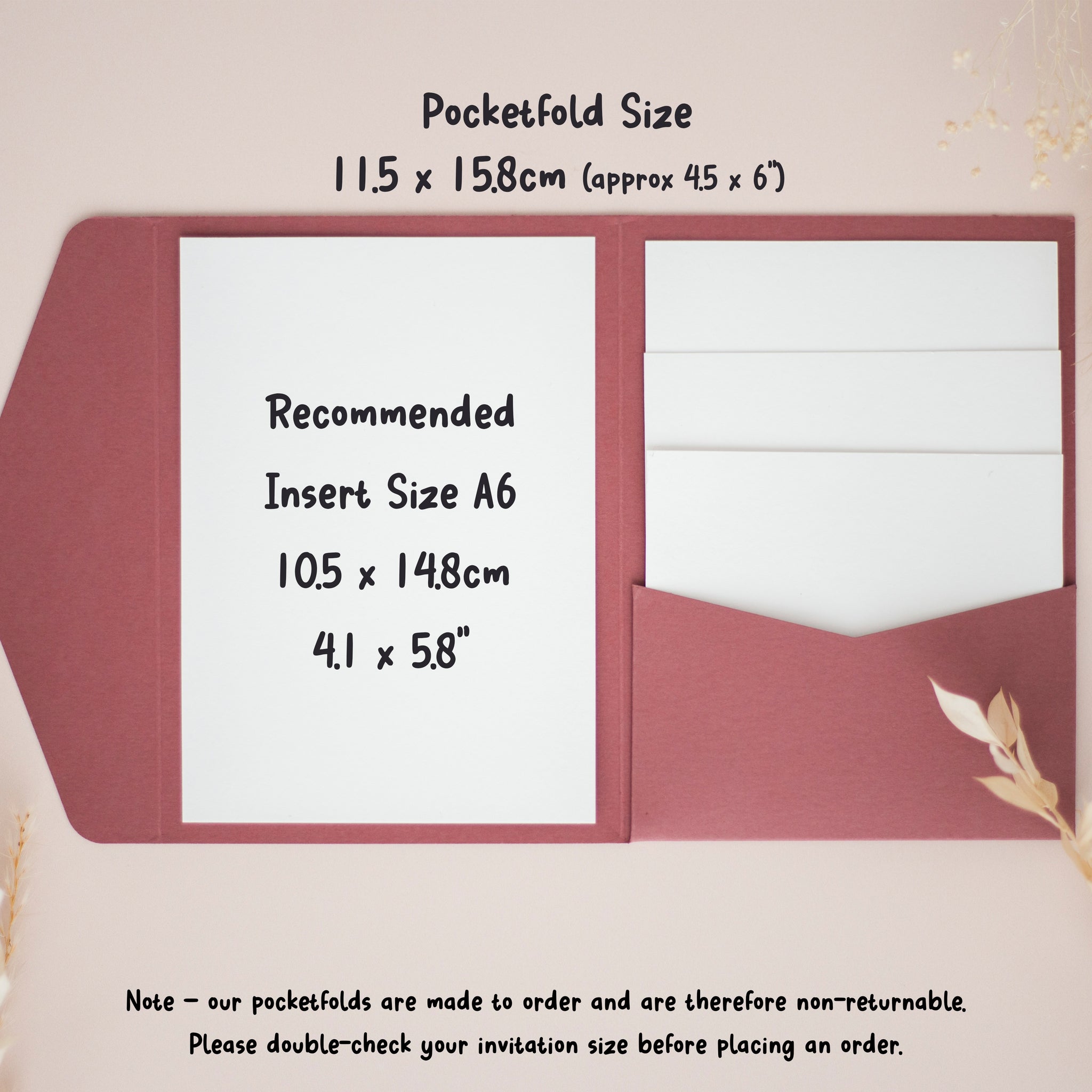Our pocketfolds measure approximately 4.5 x 6.2 inches once folded. Our Invitations and inserts are a UK A6 size, which measures approximately 10.5 x 14.8cm, and will have staggered heights if you require more than 1 insert card. If ordering options 2, 3 or 4 above, we'll also provide you with either white or Kraft mailing envelopes, that you can use to mail your pocketfold invitations to your guests. Please note as our pocketfolds are made to order, they are strictly non-refundable, so please ensure you have double checked the sizes if you are ordering option 1 and supplying your own invitations/inserts. Colours may also appear differently on screen compared to the pocketfolds and invitation designs in person, this is completely normal and not a fault.