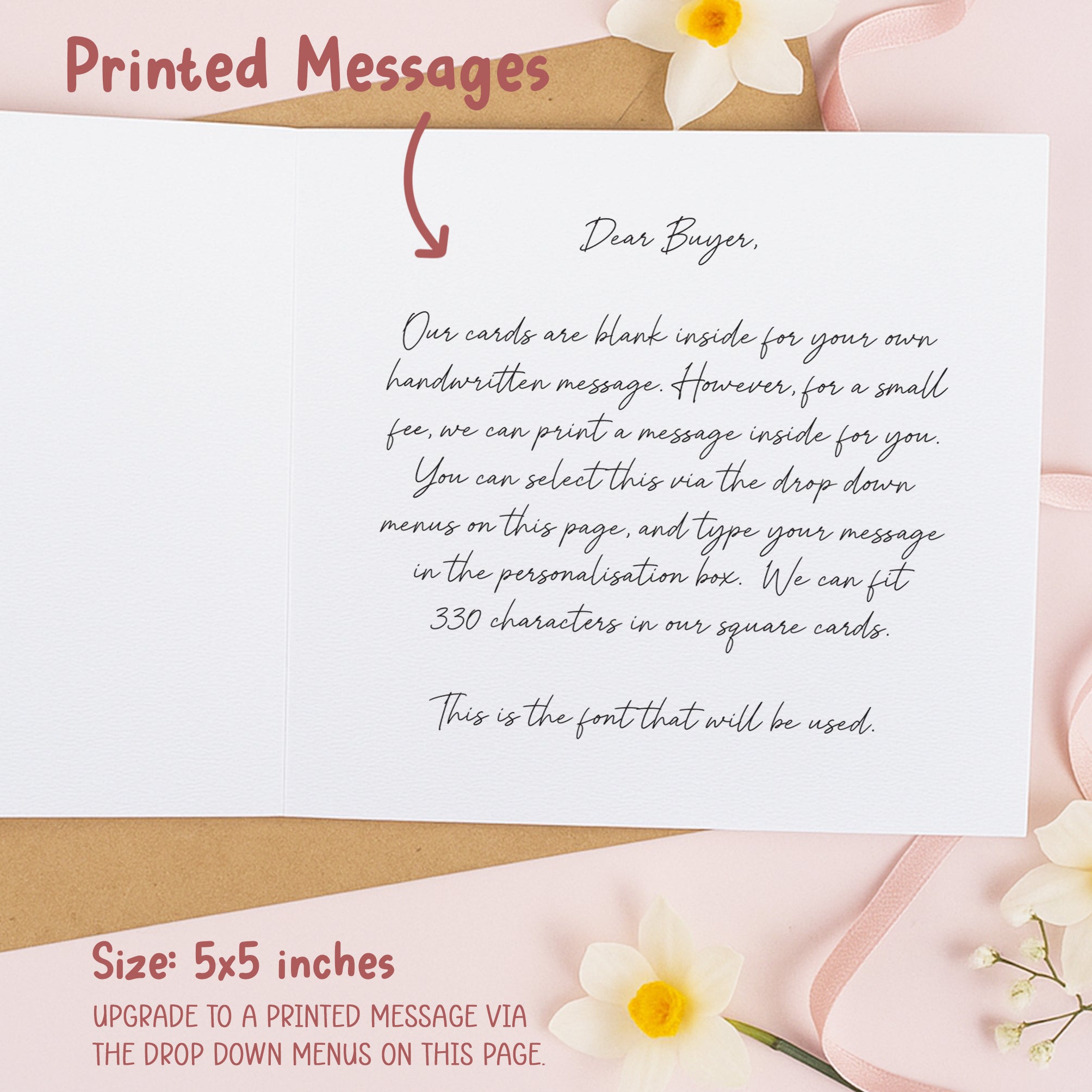Our beautiful cards measure approximately 5x5 inches when folded and are crafted from premium 350gsm thick matte cardstock, offering a luxurious feel. Each card comes with a recycled kraft brown envelope, enhancing its rustic appeal. The inside is left blank for your own personalised handwritten message, but for an added touch, you can choose to have us print a custom message inside through the dropdown menu above.