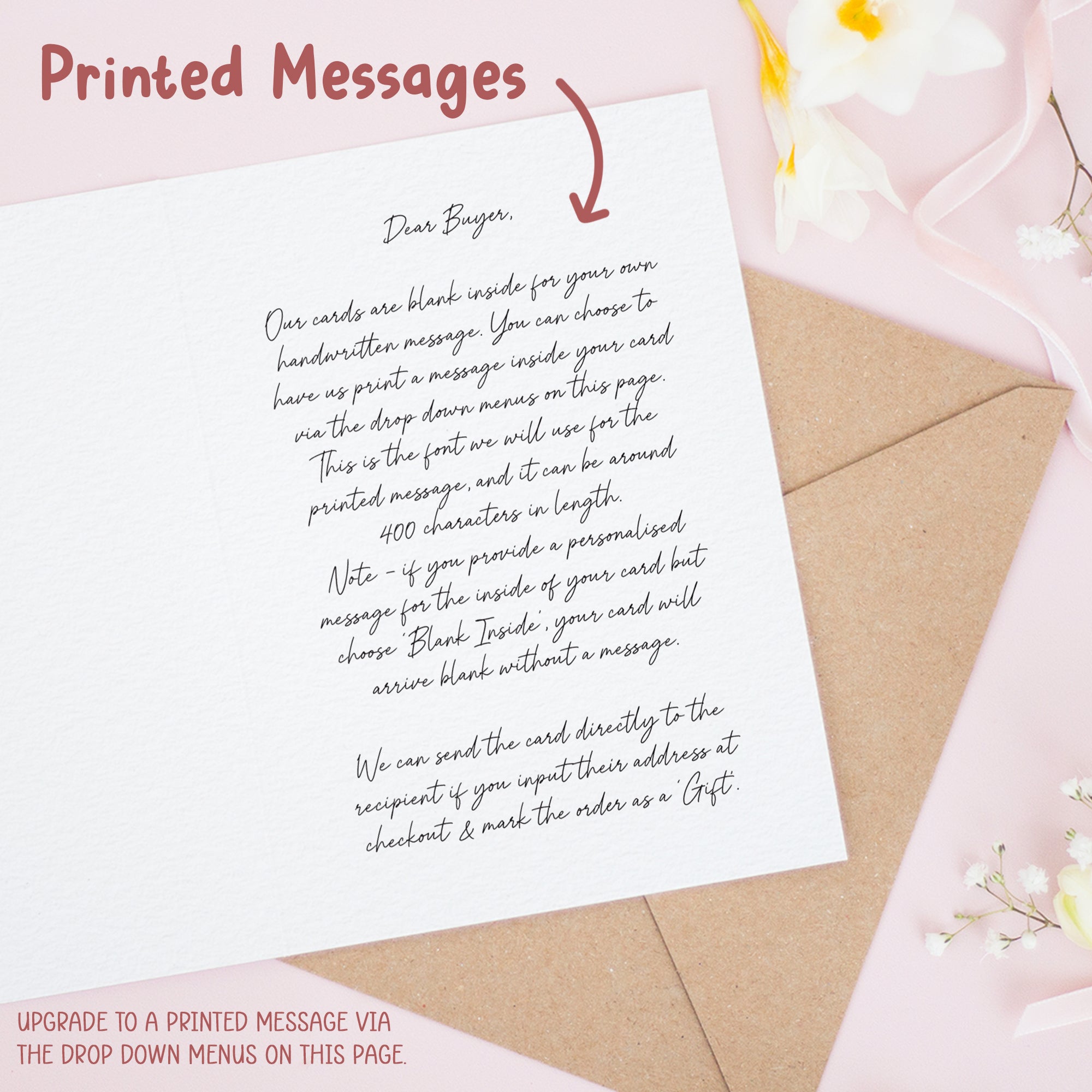 Our beautiful cards measure 5x7 inches when folded and are crafted from premium 350gsm thick matte cardstock, offering a luxurious feel. Each card comes with a recycled kraft brown envelope, enhancing its rustic appeal. The inside is left blank for your own personalised handwritten message, but for an added touch, you can choose to have us print a custom message inside through the dropdown menu above.